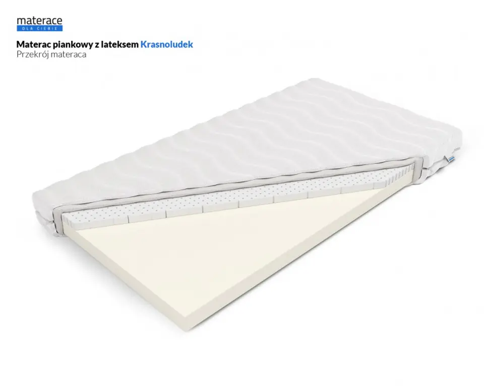 Materac Krasnoludek – Materac piankowy z lateksem i 3 strefami twardości. Zaprojektowany specjalnie dla dzieci – optymalne podparcie kręgosłupa w fazie wzrostu.