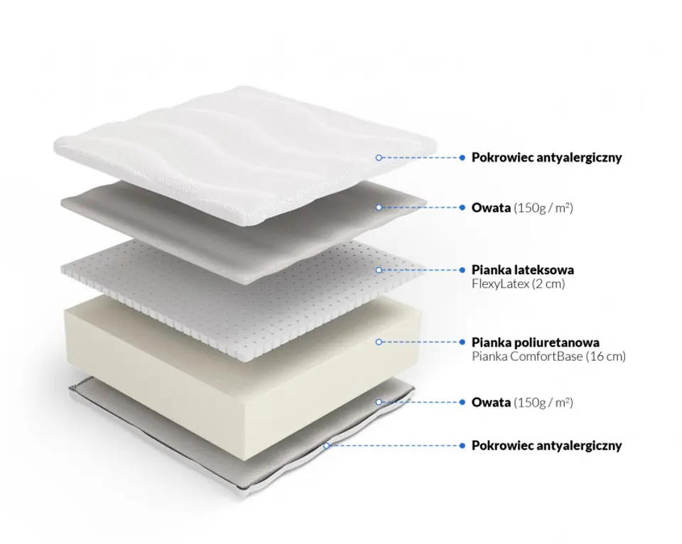 • Szukasz komfortu i wentylacji – Lateks i pianka mają porowatą strukturę. Pas wentylujący dodatkowo poprawia cyrkulację powietrza.