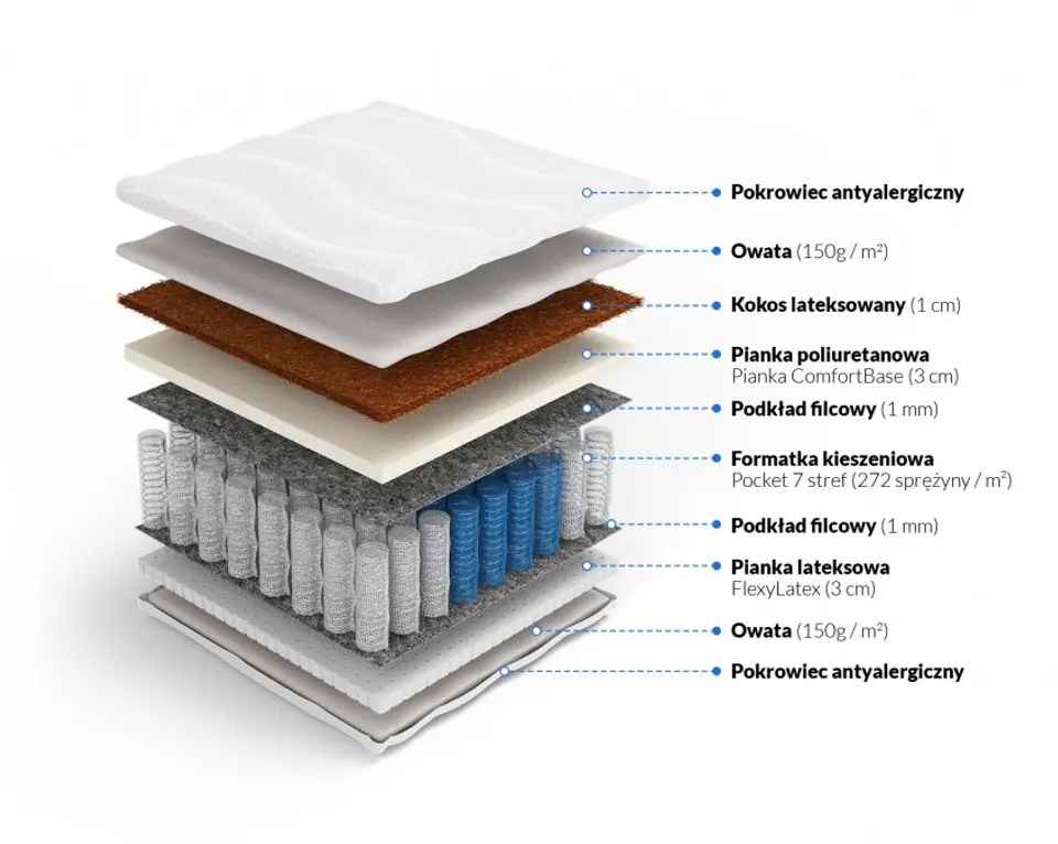 • Typ: Kieszeniowy (pocket) 7 stref z kokosem i lateksem