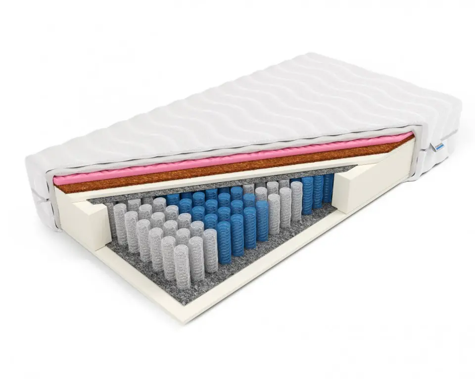 • Materiały: Sprężyny pocket, pianka poliuretanowa (3cm strona H2), pianka moletowana (3cm strona H3), kokos lateksowany (1cm)