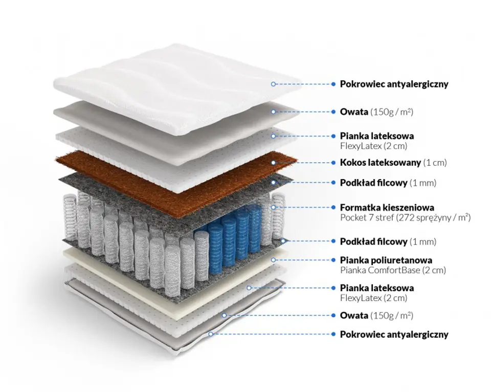 - Materiały: Sprężyny pocket, pianka FlexyLatex, kokos lateksowany