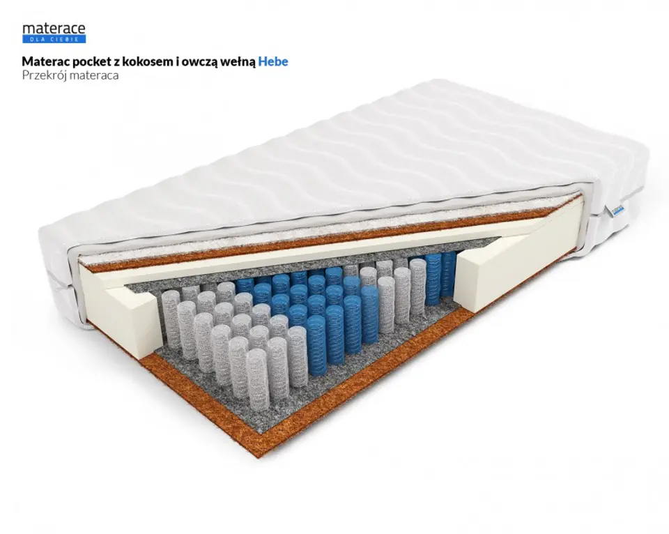 Materac Hebe – Materac pocket z 272 sprężynami/m², kokosem lateksowanym i naturalną owczą wełną. Twardy H3 dla osób od 80 kg.
