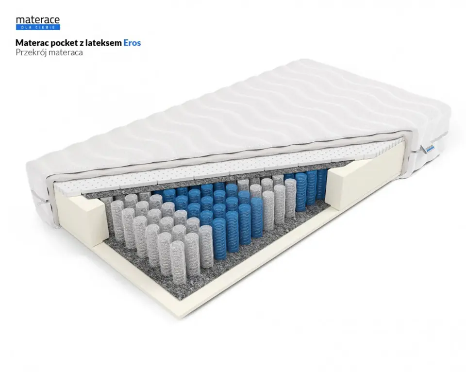 Materac Eros – Materac pocket z 272 sprężynami/m² i 7 strefami twardości. Pianka FlexyLateks z jednej strony, ComfortBase z drugiej – obie H2.