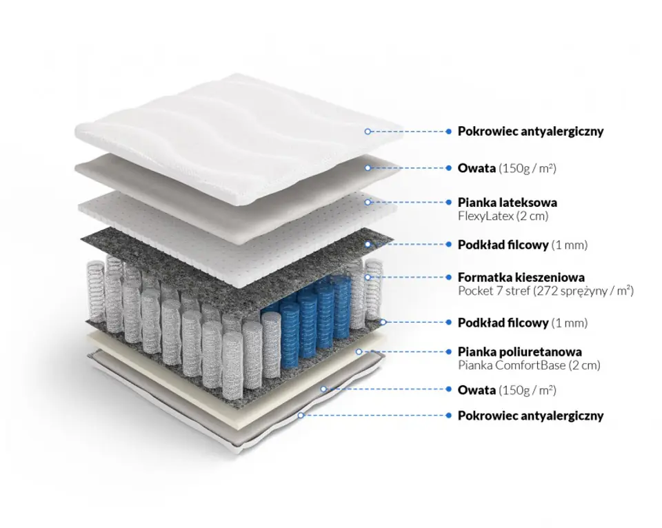 • Materiały: Sprężyny pocket, pianka FlexyLateks, pianka ComfortBase