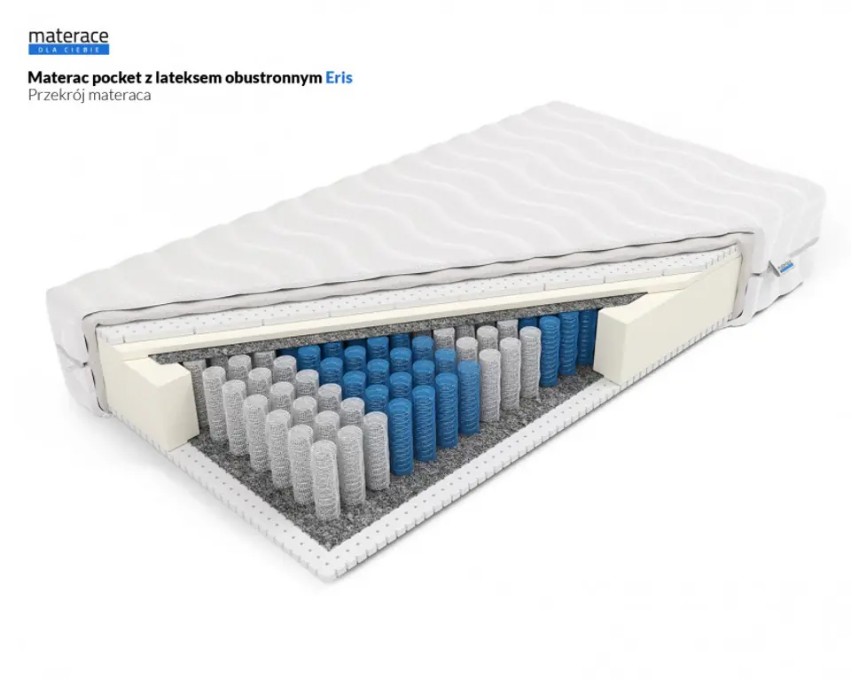 Materac Eris – Materac pocket z 272 sprężynami/m² i 7 strefami twardości. Pianka FlexyLateks z obu stron – identyczny komfort H2 po obróceniu.