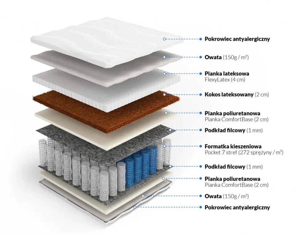 • Materiały: Sprężyny pocket, pianka FlexyLateks 4 cm, kokos lateksowany 2 cm, pianka ComfortBase