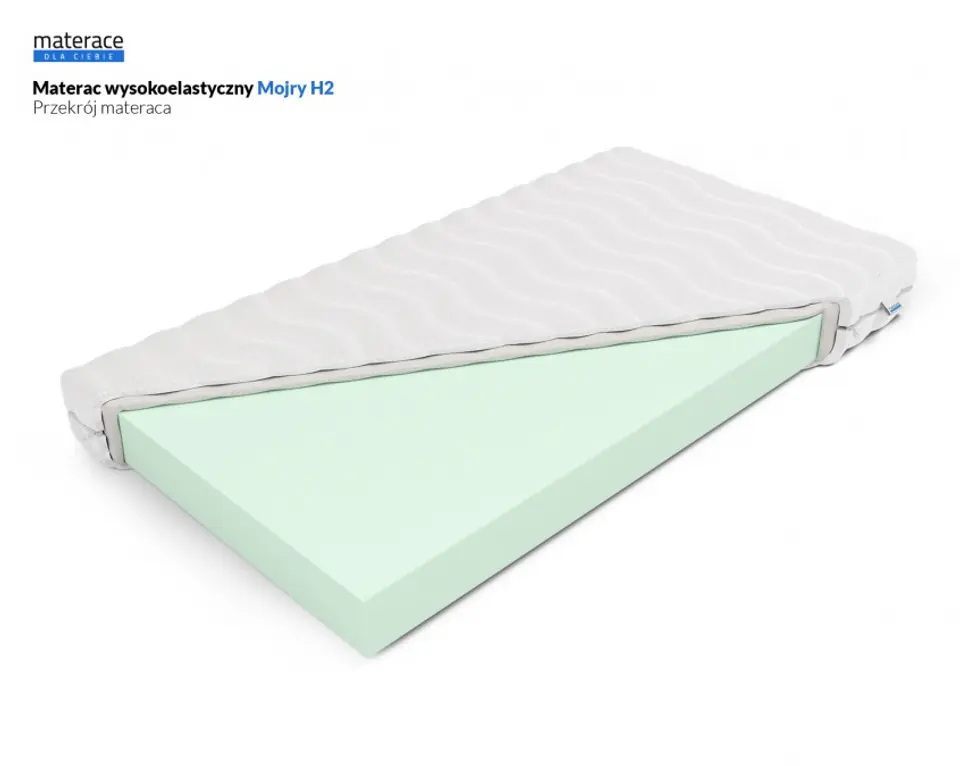 Materac Mojry H2 – Materac w całości z pianki wysokoelastycznej HR. Średnio-twarda twardość H2, idealna dla dzieci i dorosłych do 80 kg. Doskonały do stelaży regulowanych!