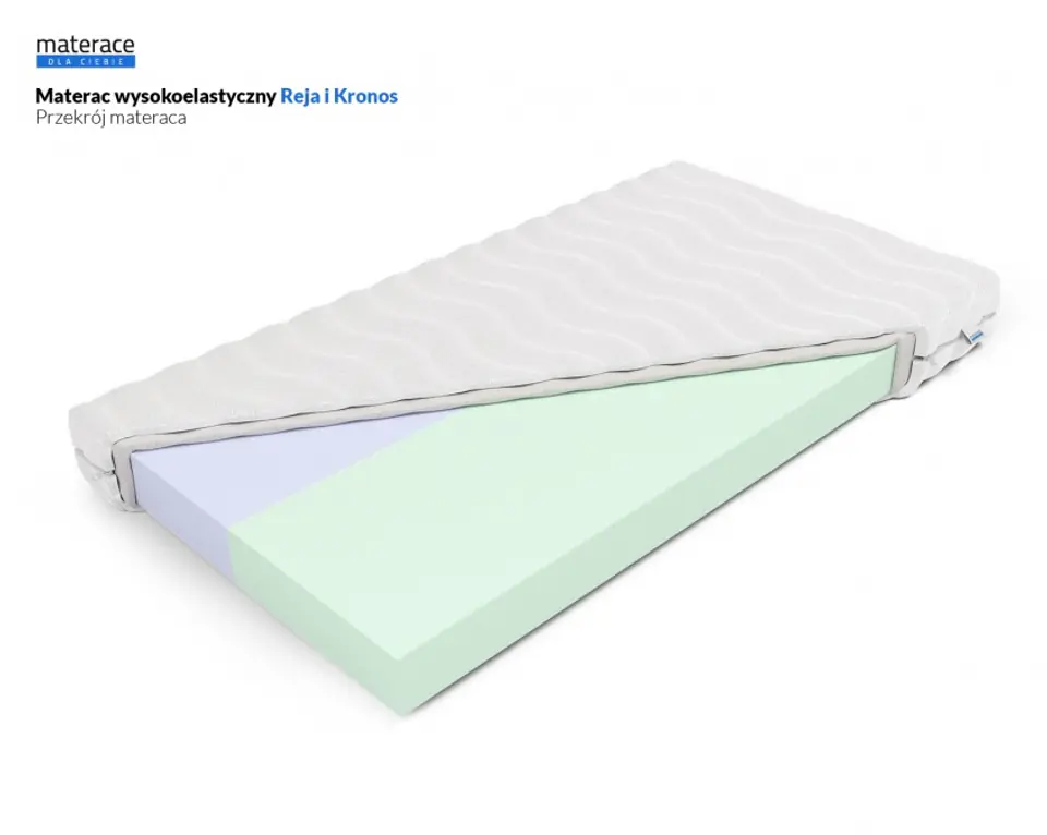 Reja i Kronos jest materacem piankowym o dwóch twardościach - jedna połowa materaca jest z kategorii miękkich, a druga jest średnia. Dwie różne twardości zawdzięcza 14-centymetrowej piance HR FreshElastic, która jest specjalnie dopasowana tak, by nadawać mu w jednej połowie miękkości, a w drugiej średniej twardości. Materac posiada właściwości ortopedyczne - dzięki temu nie trzeba martwić się o odpowiednie podparcie kręgosłupa w czasnie snu. Dodatkowo pianka HR FreshElastic zapewnia świetną wentylację i błyskawicznie reaguje na zmianę ułożenia ciała w trakcie snu. Materac jest dwustronny - z obu stron posiada te same warstwy, więc można użytkować go bez ryzyka utraty cennych właściwości. Model ten jest idealny dla par ze znaczną różnicą w wadze. Wszystkie komponenty użyte w materacu posiadają właściwości ortopedyczne oraz antyalergiczne.