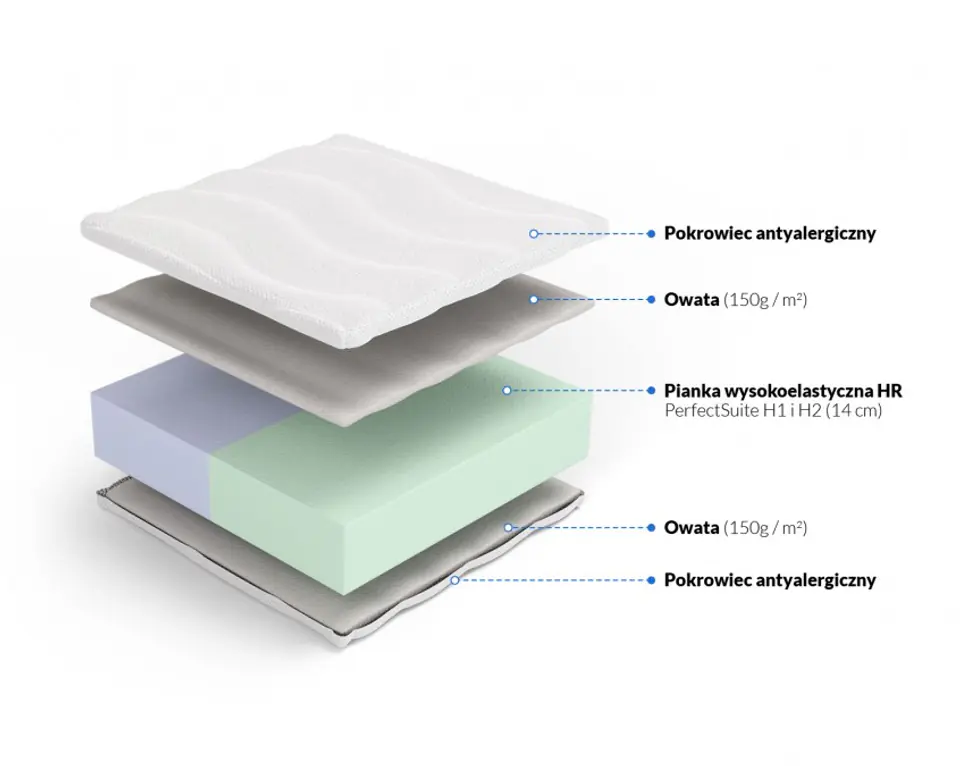Materac Reja i Kronos to model zbudowany z pianki HR FreshElastic o dwóch twardościach, przeznaczony dla par o różnej wadze. Wkład materaca posiada grubość 14 cm, jednak łączna wysokość materaca zależy od wybranego pokrowca. Produkcja materaca rozpoczyna się w ciągu 24h od zaksięgowania środków na naszym koncie. Model posiada 2-letni okres gwarancji.