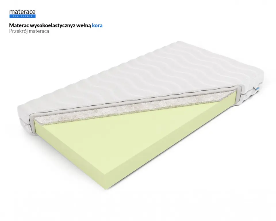 Materac Kora – Pianka wysokoelastyczna HR z warstwą owczej wełny. Funkcja lato/zima – strona z wełną grzeje zimą. Właściwości lecznicze i rehabilitacyjne!