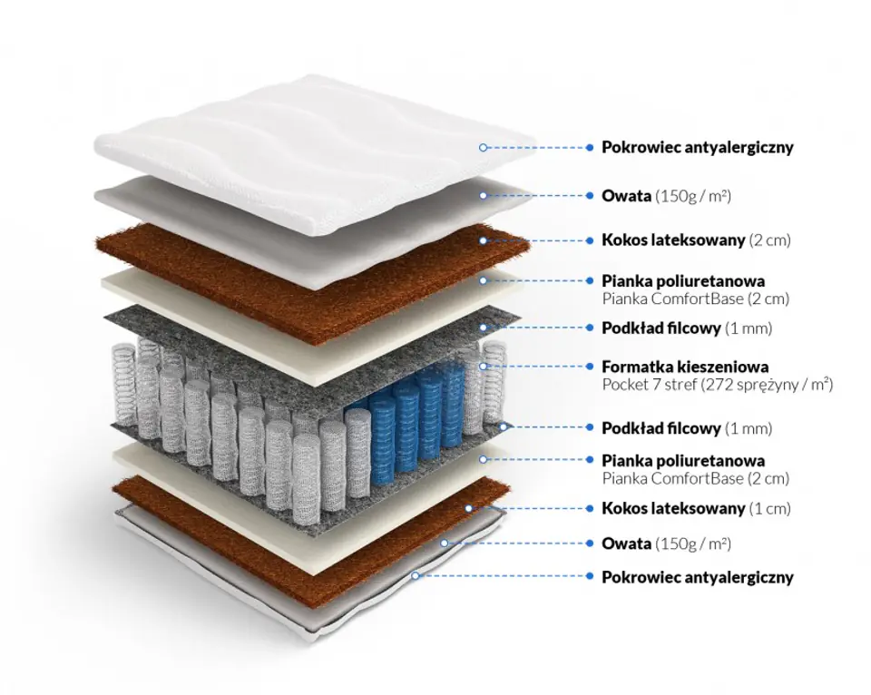 • Typ: Sprężynowy kieszeniowy (pocket) z kokosem obustronnie