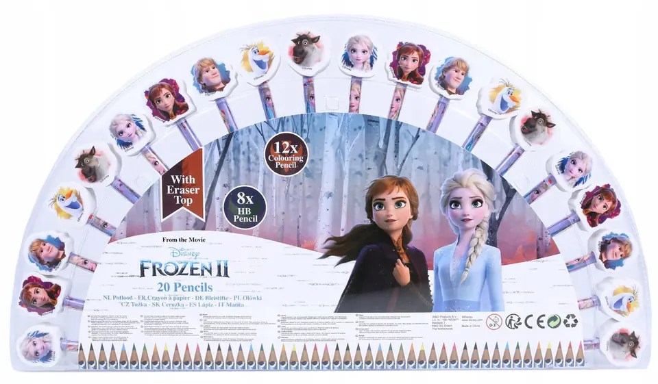 Zestaw składający się z 40 elementów: 12 kolorowych kredek, 8 ołówków i 20 gumerk, z kolekcji Disney Frozen 2.