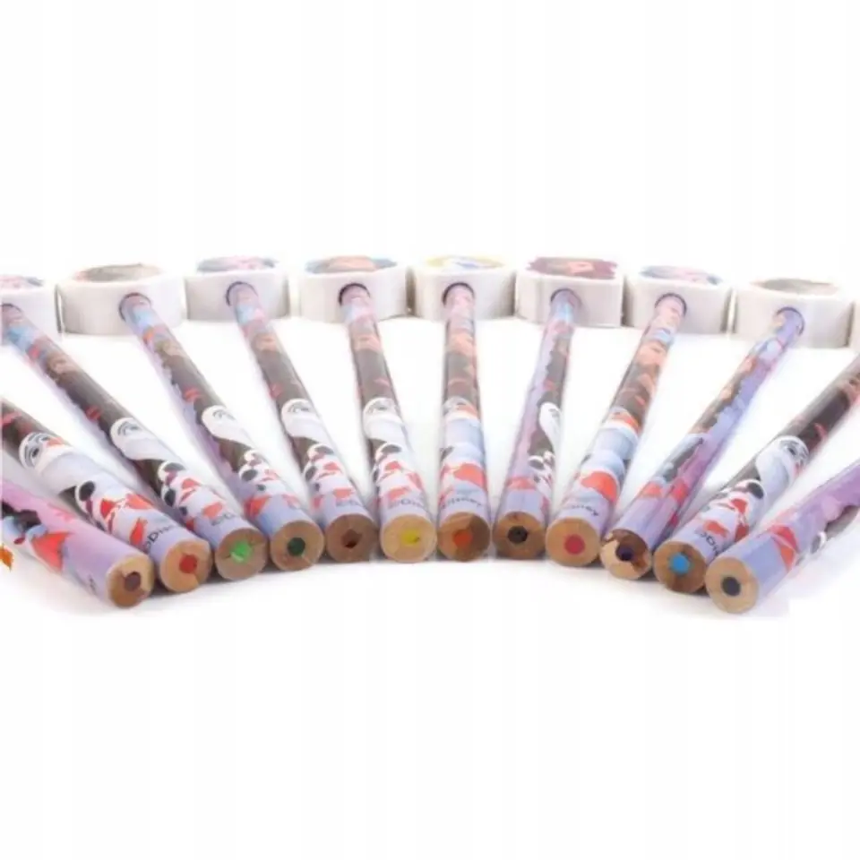 Każda kredka i ołówek na górze posiada gumkę do mazania, z postacią bohatera z bajki.