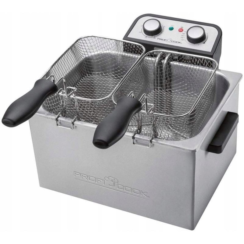 FRYTKOWNICA OLEJOWA PODWÓJNA TRADYCYJNA - 3000W FRYTOWNICA INOX 5L 3 KOSZE MOCNA STALOWANAJWYŻSZEJ JAKOŚCIPROFESJONALNA PODWÓJNA FRYTKOWNICARENOMOWANEJ FIRMY PROFICOOKMODEL: PC FR 1038Frytkownica, która dzięki pojemności 4 litrów w szybkim czasie przygotuje dużą ilość frytek oraz innych smażonych potraw dla całej rodziny.Urządzenie posiada bezstopniowy termostat oraz daje możliwość smażenia przy pomocy 1 większego lub 2 mniejszych koszy,ZESTAW ZAWIERA 3 KOSZE :1 DUŻY2 MAŁESzukasz doskonałego sposobu na przygotowanie chrupiących, złocistych frytek w domowym zaciszuNasza frytkownica olejowa to idealne rozwiązanieDzięki dużej pojemności możesz smażyć jednocześnie większe porcje, co sprawia, że jest idealna na rodzinne spotkania i przyjęcia.ProfiCook PC-FR 1038 to idealne urządzenie do przygotowywania smażonych dań z ziemniaków i mięs. Frytkownica umożliwia szybkie usmażenie idealnie chrupkich i miękkich w środku frytek. Dzięki PC-FR 1038 usmażymy również mięso, grzyby oraz warzywa.Możliwość bezstopniowej regulacji temperatury w zakresie 130 - 190°C zapewnia pełną kontrolę nad poziomem wysmażenia dań. Grzałka, obudowa oraz pokrywa wykonane są ze stali nierdzewnej.Dzięki możliwości rozłożenia na poszczególne elementy urządzenie jest trwałe i łatwe do czyszczenia.Obudowa, pokrywka, cewka grzewcza, pojemnik na tłuszcz oraz panel ze stali nierdzewnejTechnologia zimnej strefy – cewka grzewcza całkowicie zanurzona w oleju do szybkiego grzania i bezwonnego smażeniaPojemność: 4 litry oleju / tłuszczu do smażeniaBezstopniowo regulowany termostat (130° C – 190° C)Timer 30 minutowyZdejmowany pojemnik na filtr w celu łatwego czyszczeniaPokrywka z okienkiemStały filtr zapachów i oparów2 wskaźniki świetlne kontrolujące zasilanie i podgrzewanieOchrona przed przegrzaniem230 V, 50 Hz, 3000 WWysoka jakość wykonaniaObudowa, pokrywa oraz grzałka wykonane ze stali nierdzewnejWydajnośćDzięki pojemności 4 litrów w szybkim czasie przygotujesz dużą ilość frytek oraz innych smażonych potraw dla całej rodzinyŁatwe utrzymanie czystościDzięki możliwości rozłożenia na poszczególne elementy urządzenie jest łatwe w utrzymaniu czystościDzięki tej frytkownicy możesz nie tylko smażyć frytki, ale także przygotowywać inne ulubione potrawy, takie jak nuggetsy, krewetki czy warzywa.Ciesz się pysznymi, domowymi potrawami, które zachwycą Twoich bliskichNie zwlekaj! Odkryj radość z gotowania i delektuj się smakiem idealnych frytek w każdej chwili!Wymiary frytkownicy:Wymiary (ok. szer. x wys. x gł.) i wagaUrządzenie: 350 x 250 x 450 mm; 3.2 kgOpakowanie: 376 x 273 x 376 mm; 3.8 kgslimtex