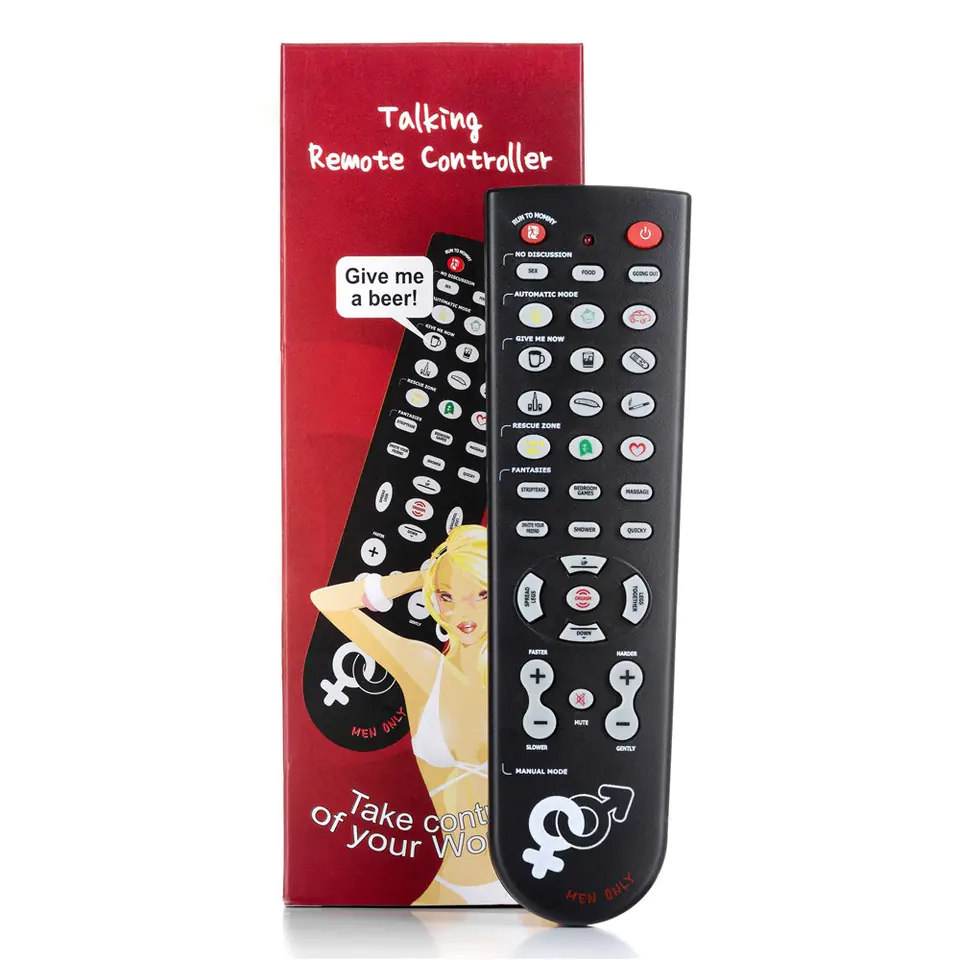 Kobiety od zawsze były nieprzewidywalne. Aż do teraz! Dzięki Gadającemu Pilotowi będziesz mógł sterować swoją kobietą, a ona już nigdy nie będzie zmuszona zgadywać, czego potrzebujesz...Gadający Pilot - Steruj kobietą! (EN) wydaje 33 zabawne komendy w języku angielskim, które uproszczą komunikację między Wami. Sprawdzi się w każdej sytuacji - szczególnie jeśli Twoja partnerka jest z innego kraju. Dla Gadającego Pilota nie ma barier. Jest w stanie wydać rozkaz każdej kobiecie, a w dodatku mówi to, o czym inni tylko myślą! Chcesz obiad? Klikasz przycisk. Masz ochotę na piwo? Klikasz przycisk. Chcesz, żeby przez chwilę w domu było cicho? Wyciszasz jej gadanie i delektujesz się idealną ciszą.To wspaniałe urządzenie jest ziszczeniem męskich marzeń. Jest świetnym prezentem dla osób z poczuciem humoru, które doceniają dobre żarty. Sprawdzi się jako upominek na Walentynki, wieczór kawalerski, osiemnastkę lub jako dodatek do prezentu na urodziny czy imieniny.Uwaga! Pilot czasami przestaje działać na niektóre kobiety, wywołując w nich wściekłość. Przed zastosowaniem upewnij się, czy Twoja partnerka ma poczucie humoru. Nagrania na pilocie: Take'em offWhere's my dinner?Goin' out with my matesGet back to the kitchenThe kids need youGo and wash the carGrab me a beer will ya?Get me some whiskyHand me the remoteGo get some vodkaWhip up something to eatGet me some cigsHmm, strip for me babeWanna fool around?I feel like a massageMaybe you've got some cute friends? Aye?Want a sponge bath?I'll take you here and nowLove you!You look … wow…You're my world babe!Bring those fine legs togetherYeah, spread those fine legsLittle higherLittle lowerYeah, that's it baby.Yeah, faster (breathe), faster (breathe)Slow down baby!Yeah, louder!Not so loud babe!Silence woman!Yeah, run back to your mommy!I'm done talkin'