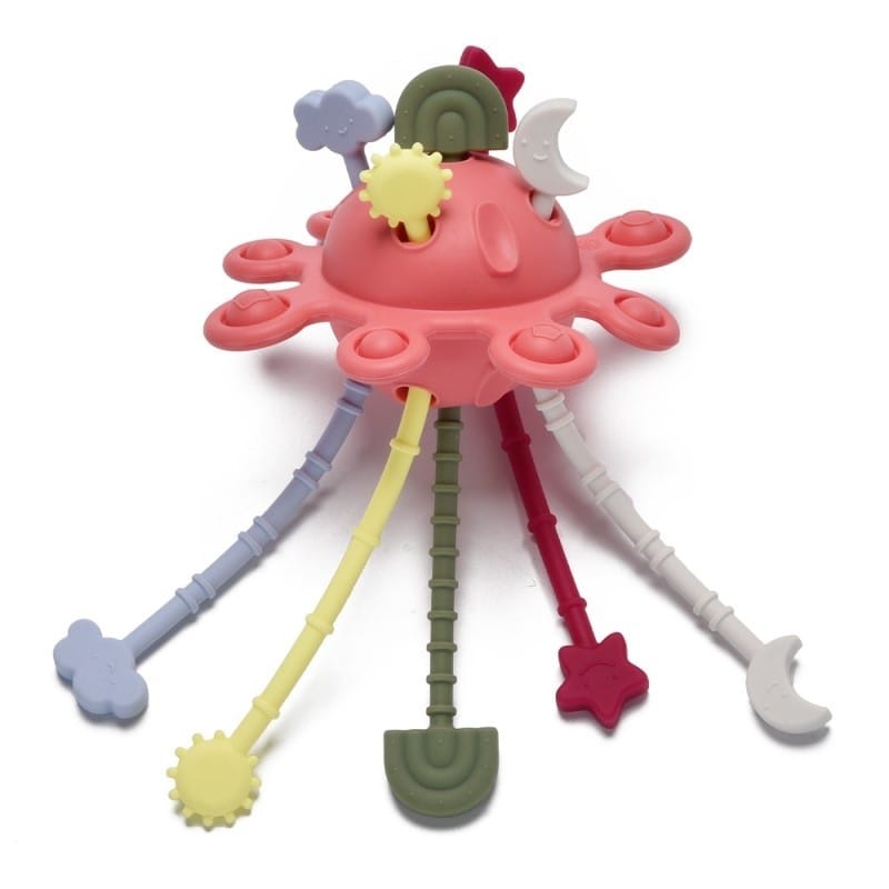 Hej, maluszku, pora na kosmiczną przygodę! Galaktyka to mięciutka zabawka wyposażona w kuleczki do wciskania. Czynność ta pomaga maluchom ćwiczyć precyzję i sprawność paluszków. Jakby tego było mało, na miłośników odlotowej zabawy, czekają tu też kolorowe linki do przeciągania, a każda z nich zakończona jest innym kształtem.