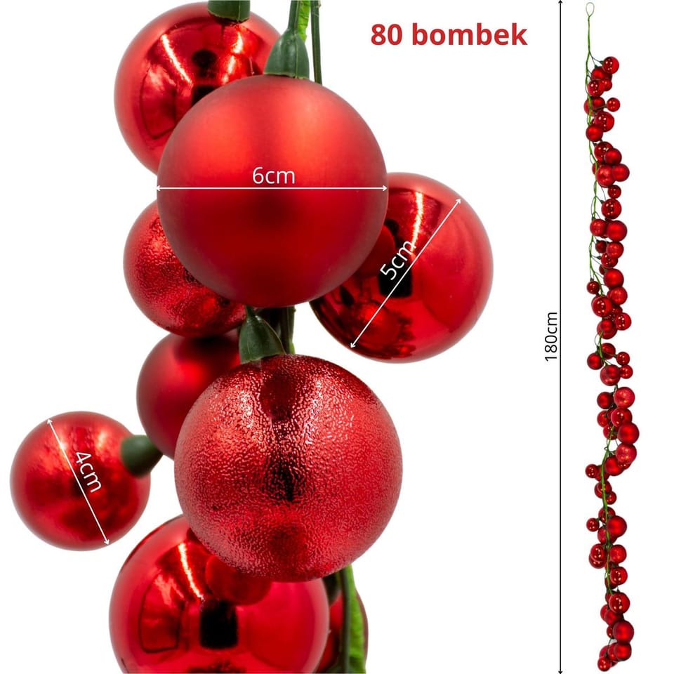 - długość 180 cm – idealna do różnych aranżacjiaż 80 bombek wkomponowanych w gałązkękażda bombka w intensywny czerwonym kolorzewygodne w przechowywaniu, zapakowane w plastikowe pudełkoukryty drucik wewnątrz girlandy umożliwia łatwe formowanie i dopasowanie jej do każdej aranżacjigotowa dekoracja – nie wymagalekka i łatwa do zamocowani