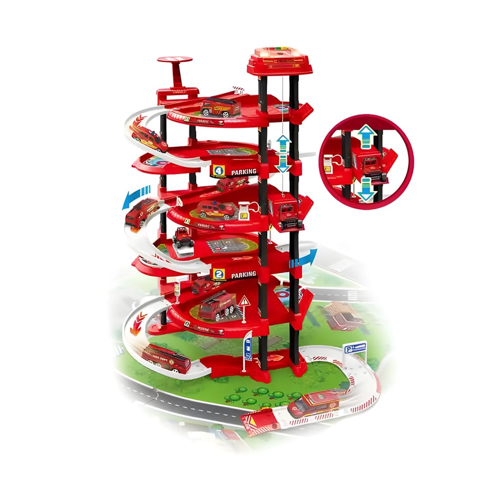 Zabawkowy garaż samochodowy zawiera wszystko, co potrzebne małemu kierowcy: