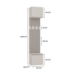 - Szafka górna z półką dzielącą przestrzeń na dwie strefy: Górna: 20,3 cm, Dolna: 16,8 cm – idealna na czapki, szaliki, torby lub pudełka