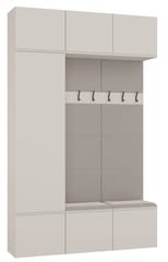 Zestaw HAGA III 1SZ2W to propozycja dla tych, którzy potrzebują więcej przestrzeni do przechowywania, nie rezygnując z nowoczesnego wyglądu. To gotowe, kompletne rozwiązanie do przedpokoju, łączące pojemny moduł szafy z drążkiem i półkami oraz 2 moduły z wieszakiem, tapicerowanym siedziskiem i szafkami.
