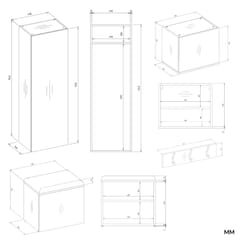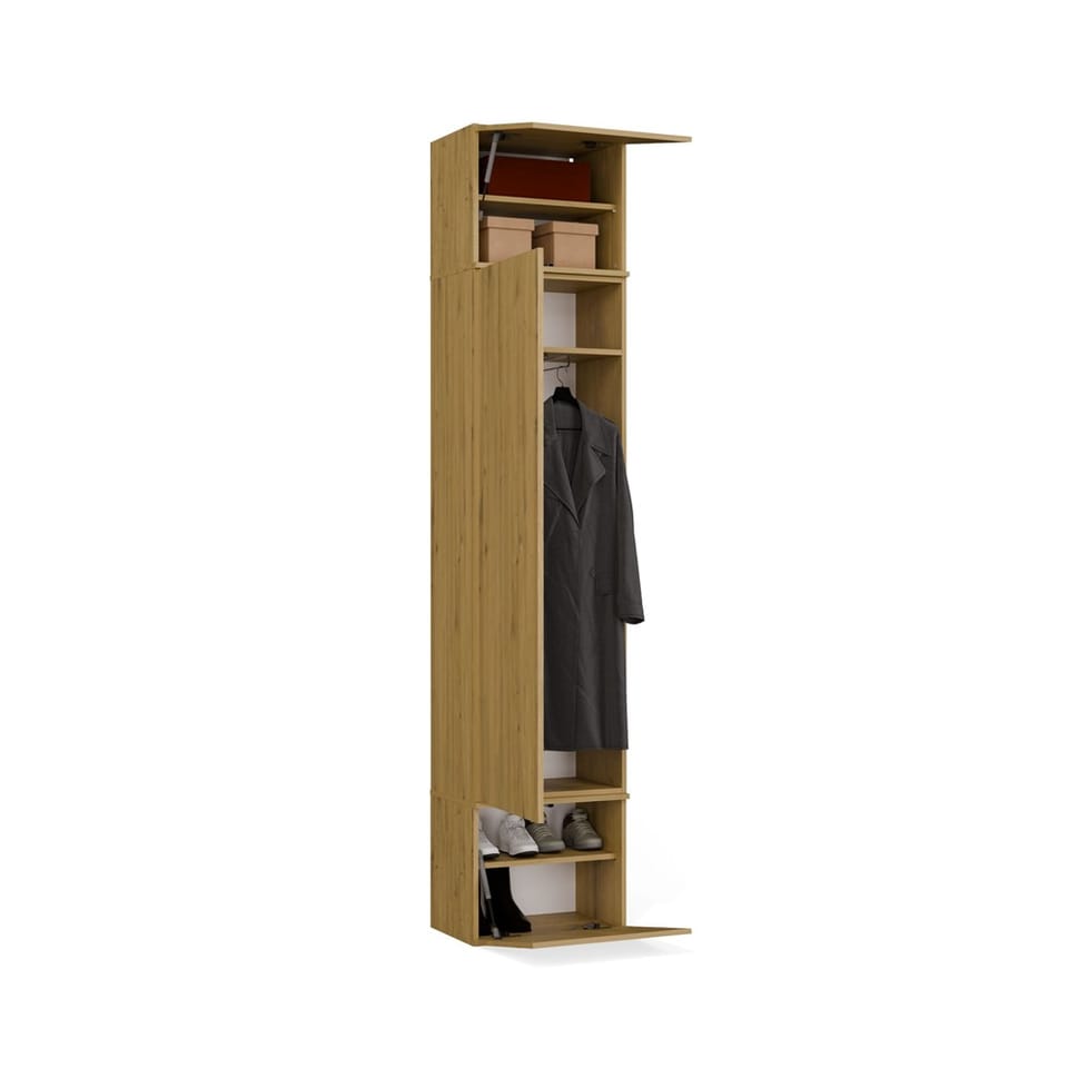 - Szafka górna z półką dzielącą przestrzeń na dwie strefy: Górna: 20,3 cm, Dolna: 16,8 cm – idealna na czapki, szaliki, torby lub pudełka