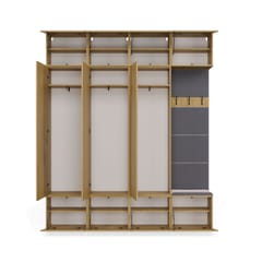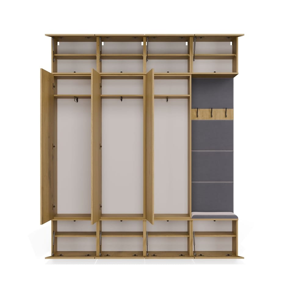 Zestaw HAGA IV 3SZ1W to propozycja dla tych, którzy potrzebują więcej przestrzeni do przechowywania, nie rezygnując z nowoczesnego wyglądu. To gotowe, kompletne rozwiązanie do przedpokoju, łączące 3 pojemne szafy z drążkiem i półkami oraz moduł z wieszakiem, tapicerowanym siedziskiem i szafkami.
