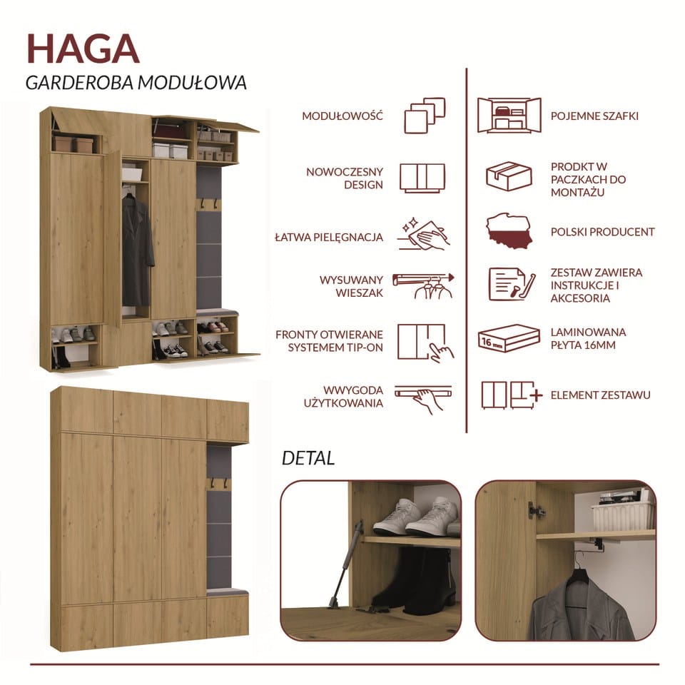 Seria mebli modułowych HAGA została zaprojektowana tak, by umożliwić dowolne zestawianie elementów - w łatwy sposób można rozbudować lub modyfikować zestaw o dodatkowe / inne moduły. Dzięki temu można stworzyć własny układ garderoby dostosowany do przestrzeni i potrzeb. Zaprojektuj swój idealny przedpokój.
