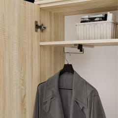 - Główna komora z drążkiem (129 cm wysokości) i półką (20 cm wysokości) – na płaszcze, kurtki, marynarki