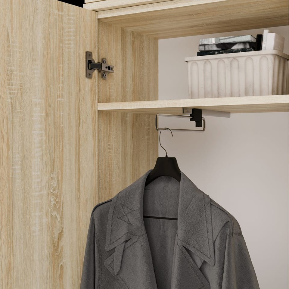 - Szerokość: 200 cm (3 szafy po 50 cm + wieszak 50 cm)