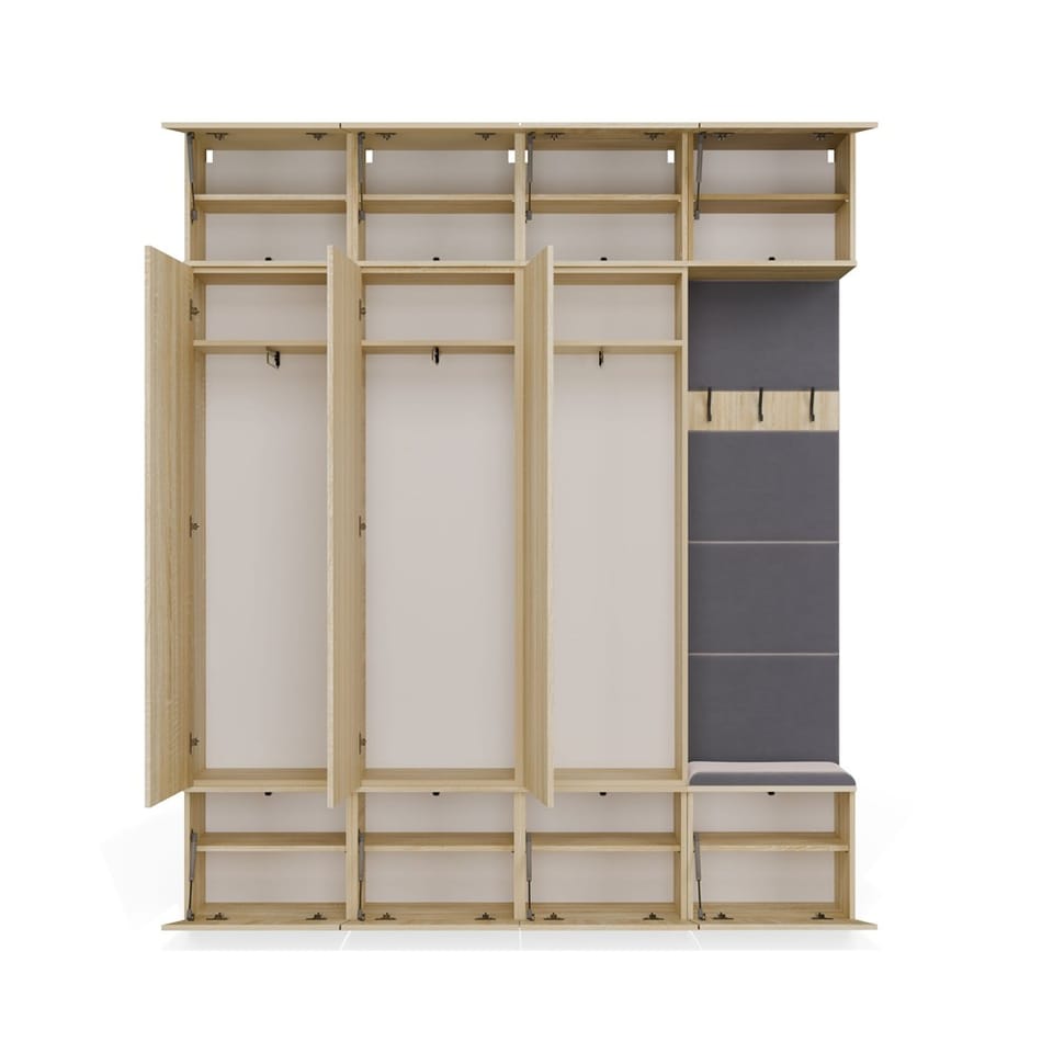 Zestaw HAGA IV 3SZ1W to propozycja dla tych, którzy potrzebują więcej przestrzeni do przechowywania, nie rezygnując z nowoczesnego wyglądu. To gotowe, kompletne rozwiązanie do przedpokoju, łączące 3 pojemne szafy z drążkiem i półkami oraz moduł z wieszakiem, tapicerowanym siedziskiem i szafkami.