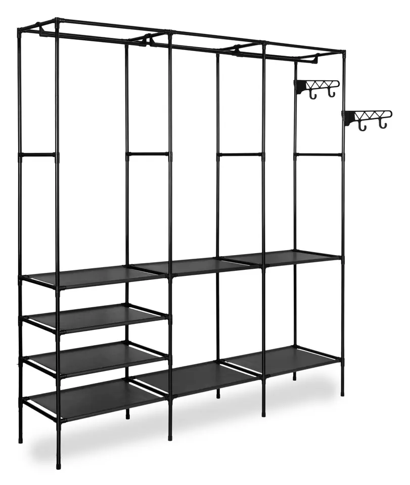 Garderoba SYNTIA z 8 półkamiPrzeznaczenie: przechowywanie odzieży i dodatków | Kolory: czarny Garderoba Syntia marki Gockowiak to doskonałe rozwiązanie do organizacji przestrzeni w Twoim domu. Ta stylowa garderoba została wykonana z wysokiej jakości stalowych rurek, które zostały malowane proszkowo, co nie tylko nadaje jej elegancki wygląd, ale także zapewnia trwałość i wyjątkową odporność. Jej przemyślana konstrukcja gwarantuje stabilność i solidność, co sprawia, że możesz być pewien, że Twoje ubrania będą bezpieczne i zorganizowane. Garderoba Syntia jest wyposażona w 8 praktycznych półek pokrytych wodoodpornym laminatem, które pozwalają na przechowywanie różnych elementów odzieży, a także 3 poziome pałąki na wiszące rzeczy, co ułatwia organizację koszul, marynarek, czy sukienek. Dodatkowo, garderoba posiada dwa regulowane wieszaki z haczykami, które możesz zamontować według swoich własnych potrzeb. To idealne miejsce na wieszaki, torby, kapelusze czy szale. Dzięki Garderobie Syntia zyskasz więcej miejsca i porządku w swoim domu, a jednocześnie dodasz mu eleganckiego charakteru. Nie czekaj dłużej - zainwestuj w garderobę Syntia i ciesz się lepszą organizacją przestrzeni! Cechy produktuMateriał: stal malowana proszkowo, tworzywo sztuczneIlość półek: 8Dwa dodatkowe uchwyty z haczykamiPółki pokryte wodoodpornym laminatemGrubość stalowych rurek: 16 mmMaksymalne równomierne obciążenie: 20 kgMaksymalne obciążenie na półkę: 2 kgMaksymalne obciążenie na uchwyt z haczykami: 2 kgMaksymalne obciążenie na pałąk: 5 kgWaga z opakowaniem: 3,3 kgKolor: czarny WymiaryWysokość: 172 cmSzerokość: 160 cmGłębokość: 35 cmMateriał półki: 46 x 35 cm Informacje dodatkowePrzedstawione kolory należy traktować poglądowo - mogą odbiegać od rzeczywistych ze względu na różne ustawienia monitorów oraz proces obróbki zdjęć. Rzeczywiste wymiary mogą się różnić od podanych wyżej. Tolerancja błędów może wynosić +/- 5%.Marka:GockowiakKod EAN:5902340329559Kolor:czarnyWysokość: 172 cmSzerokość:160 cmGłębokość:35 cmIlość półek:8