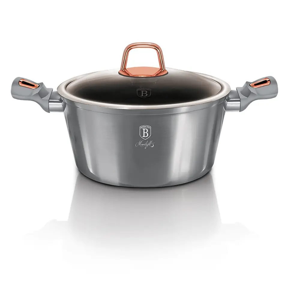 Garnki i akcesoria z serii MOONLIGHT firmy BERLINGER HAUS wykonane są z wysokiej klasy kutego aluminium pokrytego wewnątrz potrójną powłoką granitową (marble) o bardzo wysokim współczynniku twardości. Powłoka zewnętrzna w kolorze czarnym. Te atrakcyjne i modne naczynia wyposażone są standardowo w uchwyty typu SOFT TOUCH (silikon handle). Przystosowane do wszystkich rodzajów kuchenek: gazowa, elektryczna, ceramiczna, halogenowa, indukcyjna. System TURBO INDUCTION (bardzo szybko nagrzewają się) pozwala zaoszczędzić nawet 35% energii.
