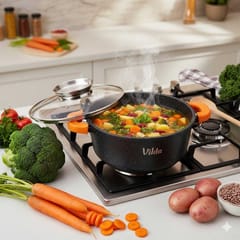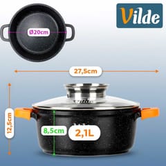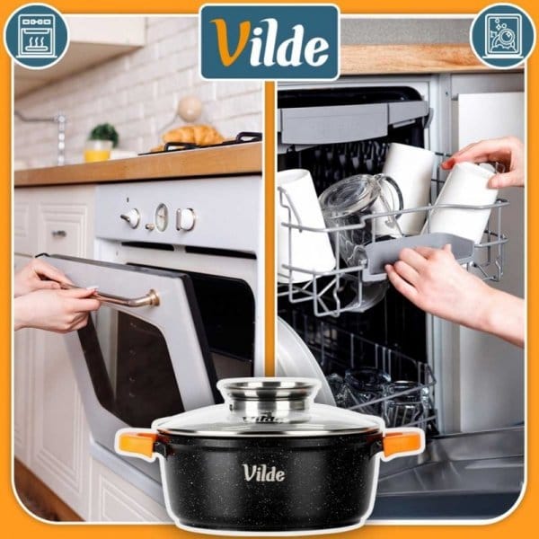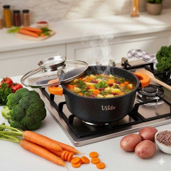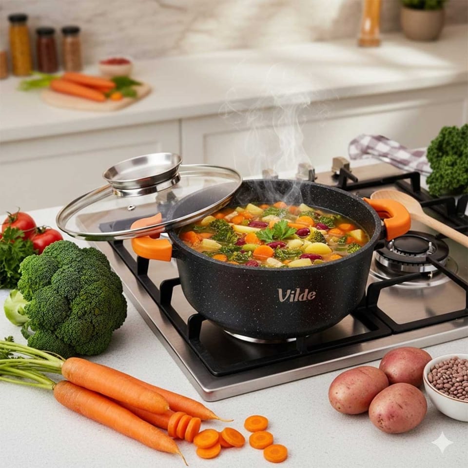 Uniwersalny garnek z pokrywką z dozownikiem oraz silikonowymi uchwytami, idealny do gotowania, pieczenia, duszenia i smażenia potraw. Przygotowane w nim dania są soczyste i aromatyczne. Garnek jest trwały, funkcjonalny i idealny do bezpośredniego serwowania dań na stole. Oryginalny produkt marki Vilde z linii Terruna Aroma. Wyprodukowano zgodnie z europejskimi standardami.