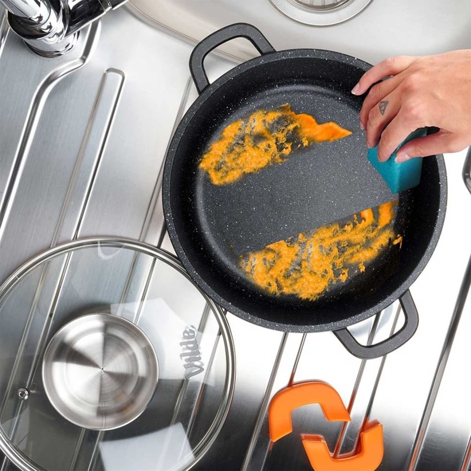 - Granitowa powłoka i żaroodporna pokrywka - Garnek wykonany jest z odlewu aluminium z nieprzywierającą powłoką granitową, co umożliwi przygotowanie potraw na minimalnej ilości tłuszczu. Pokrywka jest żaroodporna, uchwyt w pokrywce wykonany jest ze stali nierdzewnej. W zestawie praktyczne uchwyty do garnka wykonane z silikonu w pomarańczowym kolorze.