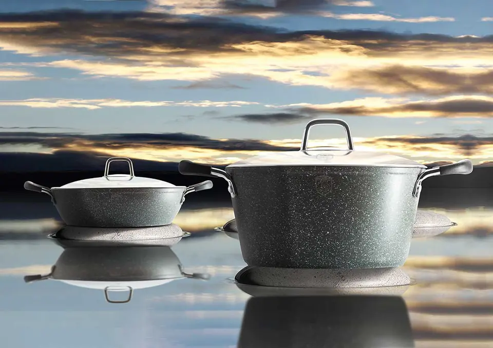 Wytrzymałe naczynia z prasowanego aluminium umożliwiają przygotowywanie potraw bez przywierania i z małą ilością tłuszczu.Potrójna warstwa marmurowa sprawia, że patelnie są niezwykle odporne na zarysowania. Można w nich przygotować pyszne i zdrowe potrawy, które nie utracą soczystości i walorów odżywczych. Nadają się do wszystkich rodzajów kuchenek: gazowych, elektrycznych, ceramicznych, halogenowych i indukcyjnych.