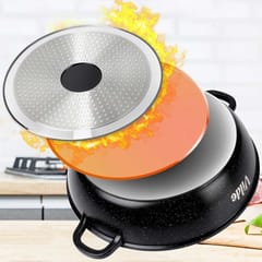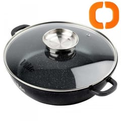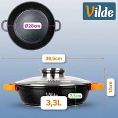 Garnek płaski, głęboka patelnia o pojemności 3,3 l z granitową powłoką, żaroodporną pokrywką z dozownikiem oraz silikonowymi uchwytami. Idealna do gotowania, duszenia, pieczenia i zapiekania różnych potraw.