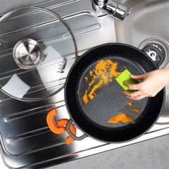 - Granitowa powłoka i żaroodporna pokrywka - Patelnia wykonana jest z odlewu aluminium z nieprzywierającą powłoką granitową, co umożliwia smażenie i duszenie na minimalnej ilości tłuszczu. Pokrywka jest żaroodporna, a jej uchwyt wykonano ze stali nierdzewnej. W zestawie znajdują się praktyczne silikonowe nakładki w pomarańczowym kolorze.