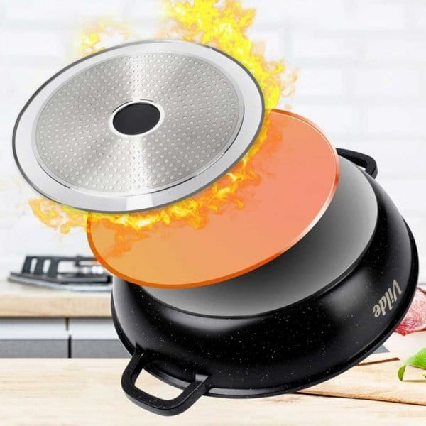 - Odporna na wysokie temperatury - Patelnia jest odporna na wysokie temperatury, dzięki czemu doskonale sprawdzi się zarówno do smażenia, jak i duszenia oraz zapiekania potraw. Odpowiednia do stosowania na kuchenkach gazowych, elektrycznych, ceramicznych oraz indukcyjnych. Posiłki można przygotowywać w niej również w piekarniku do 200°C (bez pokrywki), a z pokrywką poniżej 180°C. Nadaje się do mycia w zmywarce do naczyń.