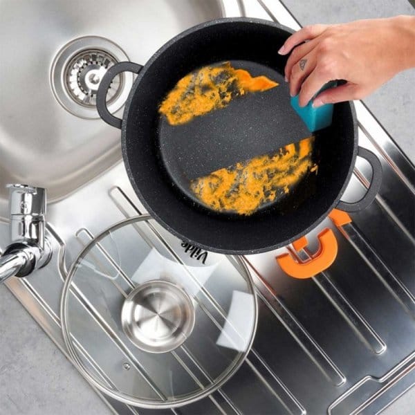 - Granitowa powłoka i żaroodporna pokrywka - Garnek wykonany jest z odlewu aluminium z nieprzywierającą powłoką granitową, co umożliwi przygotowanie potraw na minimalnej ilości tłuszczu. Pokrywka wykonana ze szkła, uchwyt w pokrywce wykonany jest ze stali nierdzewnej. W zestawie praktyczne uchwyty do garnka wykonane z silikonu w pomarańczowym kolorze.
