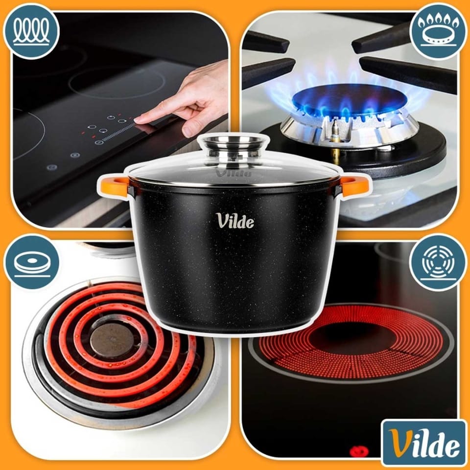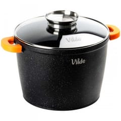 Duży garnek z pokrywką z dozownikiem oraz silikonowymi uchwytami, idealny do gotowania, pieczenia, duszenia i smażenia potraw. Przygotowane w nim dania są soczyste i aromatyczne. Garnek jest trwały, funkcjonalny i idealny do bezpośredniego serwowania dań na stole. Oryginalny produkt marki Vilde z linii Terruna Aroma. Wyprodukowano zgodnie z europejskimi standardami.