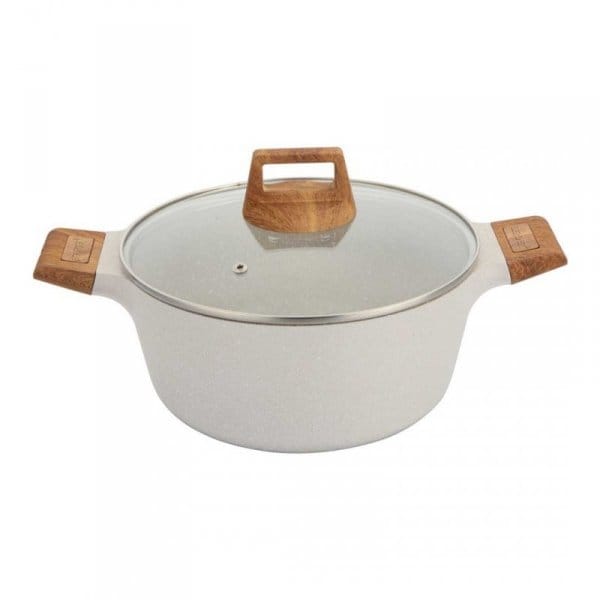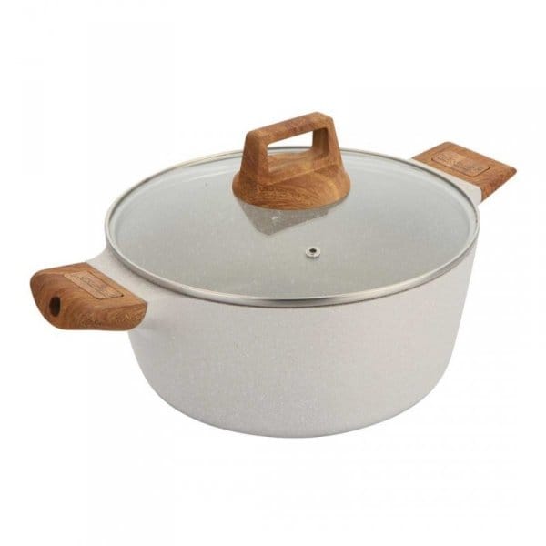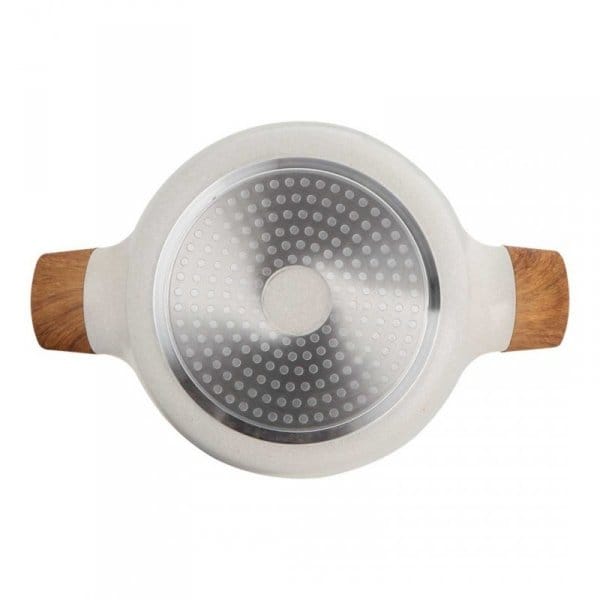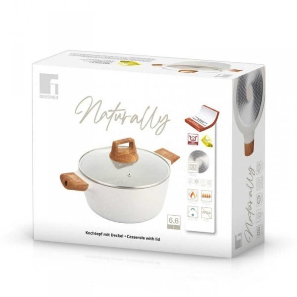 Naczynia z serii NATURALLY firmy BERGNER wykonane są z wysokiej klasy odlewanego aluminium pokrytego wewnątrz potrójną powłoką marmurkową (Marble+) o bardzo wysokim współczynniku twardości. Powłoka zewnętrzna w kolorze naturalnym piaskowym Te atrakcyjne i modne naczynia wyposażone są standardowo w uchwyty typu SOFT TOUCH (silikon handle) imitujące drewno. Przystosowane do wszystkich rodzajów kuchenek: gazowa, elektryczna, ceramiczna, halogenowa, indukcyjna.