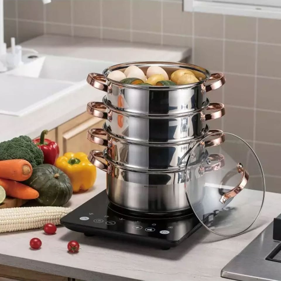 Komplet garnków do gotowania na parze wykonany jest z wysokiej jakości stali nierdzewnej. Wykorzystana stal składa się z najlepszej jakości stopu powszechnie stosowanego w światowej klasy produktach, co gwarantuje jej wysoką odporność na korozję oraz bardzo dobrą wytrzymałość. Zastosowany materiał umożliwia szybkie podgrzanie potraw i przez dłuższy czas utrzymuje ciepło. Produkt przystosowany do gotowania na kuchenkach indukcyjnych, gazowych, elektrycznych, ceramicznych i halogenowych. Można go bezpiecznie myć w zmywarkach.