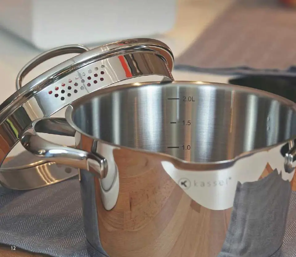 Garnek posiada wygodną i praktyczną pokrywę ze szkła hartowanego z otworem odprowadzającym parę oraz kołnierzem z sitkiem, które służy do odcedzania gotowanych w wodzie warzyw czy makaronów.