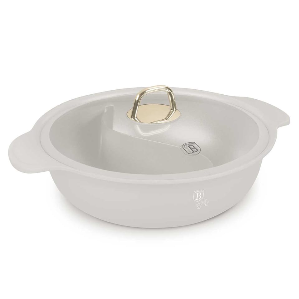 Płytki garnek typu Hot Pot o średnicy 30 cm to wyjątkowy produkt, który łączy w sobie funkcjonalność, elegancję i innowacyjny design. Unikalna przegroda w kształcie litery "S" umożliwia jednoczesne gotowanie dwóch różnych potraw, co idealnie sprawdzi się w przypadku zup, bulionów czy innych dań, które wymagają osobnych przestrzeni. Dzięki możliwości stosowania w piekarniku do +220°C i technologii turboindukcji, garnek doskonale nadaje się do różnych metod gotowania.