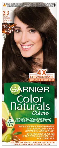 Formuła kremu koloryzującego Garnier Color Naturals wzbogacona w olejek z oliwek wnika we wnętrze włosa, aby wydobyć długotrwały kolor z lśniącymi refleksami i zapewnić 100% pokrycia siwych włosów. Kremowa formuła z 3 olejkami odżywia i wygładza włókno włosa: włosy odżywione są elastyczne i miękkie w dotyku.