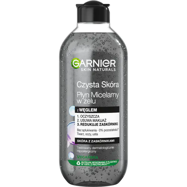 Nowa, wegańska* formuła Płynu Micelarnego Garnier Czysta Skóra w formie delikatnego żelu zawiera zawiera wysoce skuteczne składniki, by dokładne oczyszczać skórę i redukować niedoskonałości już po pierwszym użyciu: