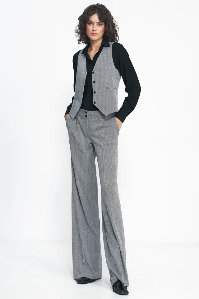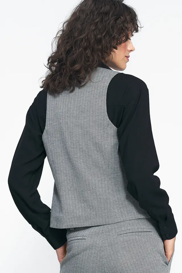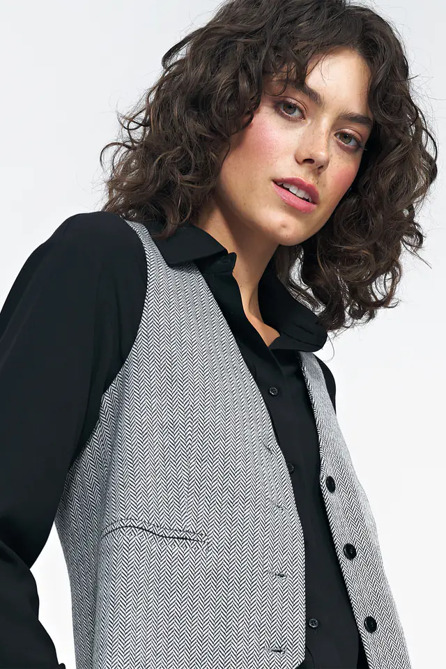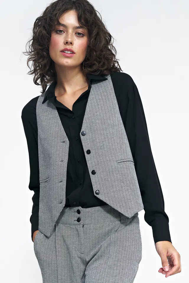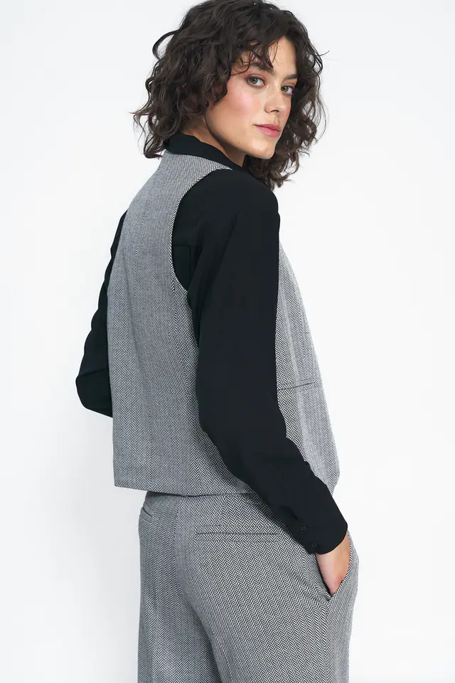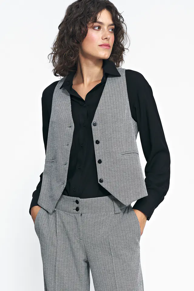 Szukasz stylowej i wszechstronnej kamizelki, którą można dodać do swojej garderoby? Mamy dla Ciebie idealną propozycję! Ta kamizelka to genialne uzupełnienie zarówno eleganckiego stylu np. pod marynarkę jak i sportowego do jeansów i sneakersów. Dzięki swojemu eleganckiemu designowi ta kamizelka na pewno stanie się stałym elementem Twojej garderoby na wiele lat. Skład: 65% wiskoza, 30% poliester, 5% poliuretan Podszewka: 100% poliester Modelka na zdjęciu ma 176 cm wzrostu i ma sobie rozmiar 36.