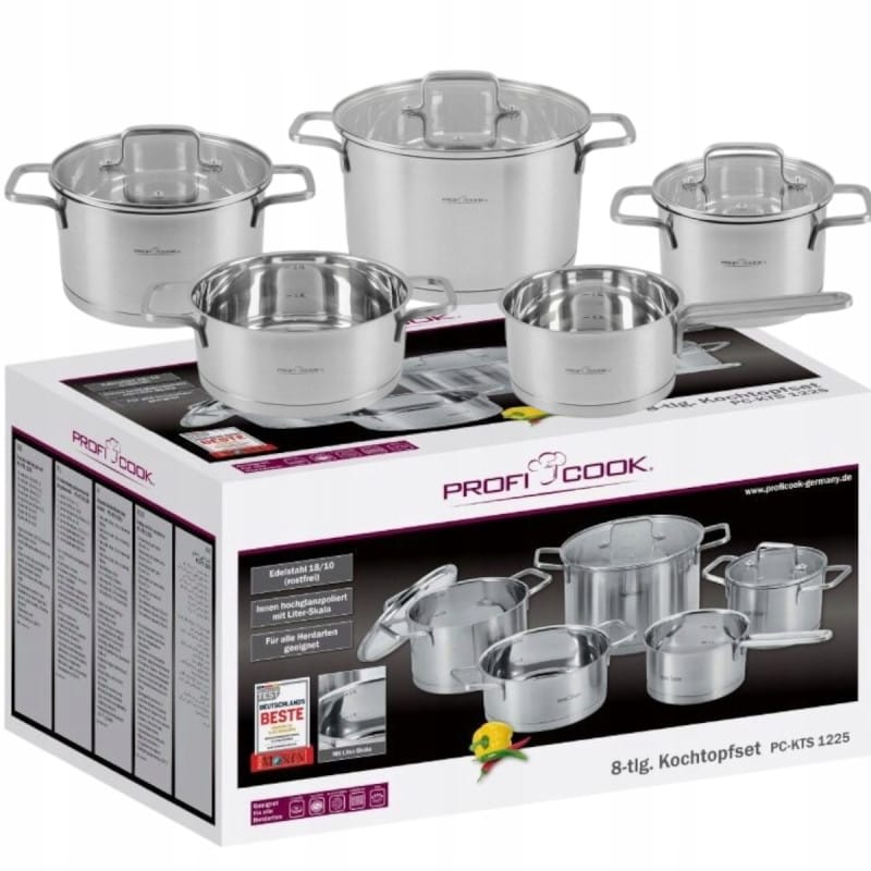NAJWYŻSZEJ JAKOŚCIZESTAW GARNKÓWRENOMOWANEJ FIRMY PROFICOOKmodel: PC-KTS 1225Zestaw garnków wykonany z wysokogatunkowej stali nierdzewnej najwyższej jakości. Polerowana powierzchnia zewnętrzna ozdobiona jest estetycznym satynowym pasem, wewnętrzna zaś w całości polerowana z podziałką litrażową.Wielowarstwowe dno pozwala równomiernie rozprowadzać i akumulować ciepło. Zestaw przystosowany jest do każdego rodzaju kuchenek, żaroodporny oraz przystosowany do mycia w zmywarce.ProfiCook PC-KTA 1225 to zestaw 5 garnków o pojemności 1l; 1,5l; 2l; 3l; 5l oraz 3 pokrywek o średnicy 16cm; 20 cm i 24 cm. Garnki zostały wykonane z wysokogatunkowej stali nierdzewnej 18/10 – najwyższej jakości stali używanej do produkcji naczyń kuchennych. Powierzchnia zewnętrzna posiada estetyczne, satynowe wykończenie. Wewnętrzna powierzchnia w całości polerowana, zaopatrzona jest w podziałkę litrażową – dzięki temu wiemy dokładnie jaką ilość składników umieszczamy w naczyniu.Odpowiedniej grubości, wielowarstwowe dno garnków pozwala równomiernie rozprowadzać i akumulować ciepło. Zapobiega również przywieraniu gotowanych potraw. Do produkcji pokrywek użyto wstrząsoodpornego szkła które zminimalizuje ryzyko stłuczenia przy upadku z wysokości. Dzięki transparentności jesteśmy w stanie kontrolować proces gotowania. Brzegi pokrywek, uchwyty oraz odpowietrzenie wykonano tak jak same garnki – z wysokogatunkowej stali nierdzewnej.Zestaw przystosowany jest do każdego rodzaju kuchenek: indukcyjnych, elektrycznych, ceramicznych, halogenowych oraz gazowych. Ponadto jest żaroodporny do 250°C oraz przystosowany do mycia w zmywarce.ProfiCook PC KTS 1225 odpowiada na potrzeby większości użytkowników i przede wszystkim wpisuje się w wymaganie techniczne zarezerwowane dla garnków najwyższej jakości. Jego zalety docenią zarówno doświadczeni kucharze jak i osoby zaczynające swoją przygodę z gotowaniem. Przygotowywanie potraw z tym zestawem będzie proste, szybkie, bezpieczne i przyjemne. A dodatkowo będą Państwo mogli się nim cieszyć wiele lat. Skład kompletu garnków:Garnek do sosów średnicy 16 cm O i pojemności 1.0 lGarnek do sosów średnicy 20 cm O i pojemności 2.0 lGarnek do gotowania mięsa średnicy 16 cm O i pojemności 1.5 lGarnek do gotowania mięsa średnicy 20 cm O i pojemności 3.0 lGarnek do gotowania warzyw średnicy 24 cm O i pojemności 5.0 lSzklana pokrywka o średnicy 16 cm OSzklana pokrywka o średnicy 20 cm OSzklana pokrywka o średnicy 24 cm ONajważniejsze cechy zestawu garnków ProfiCook PC KTS 1225:Wysokogatunkowa stal nierdzewna 18/10Polerowana powierzchnia wewnętrzna z podziałką litrażowąPokrywki ze wstrząsoodpornego szkła z metalowym rantemUchwyty ze stali nierdzewnejCylindryczny kształt z szeroką wylewkąWielowarstwowe dnoNadaje się do wszystkich typów kuchenekPrzystosowany do mycia w zmywarceŻaroodporny do 250 °CEstetykaPowierzchnia zewnętrzna posiada estetyczne, satynowe wykończenie. Wewnętrzna powierzchnia w całości polerowana, zaopatrzona jest w podziałkę litrażową.Wysoka jakośćGarnki zostały wykonane z wysokogatunkowej stali nierdzewnej 18/10 – najwyższej jakości stali używanej do produkcji naczyń kuchennych.UniwersalnośćZestaw przystosowany jest do każdego rodzaju kuchenek: indukcyjnych, elektrycznych, ceramicznych, halogenowych oraz gazowych. Ponadto jest żaroodporny do 250°CWszechstronnośćZestaw składa się z 5 garnków o pojemności 1l; 1,5l; 2l; 3l; 5l oraz 3 pokrywek o średnicy 16cm; 20 cm i 24 cm. Przeznaczony jest między innymi do gotowania sosów, mięsa i warzyw.slimtex