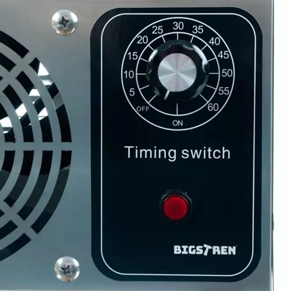 - SPECYFIKACJA - materiał: stal nierdzewna, pozostałe: ABS + guma + PVC + PC; moc zmienna od 50 do 120 W; wydajność: 20 000 mg/h; timer: 1-60 minut; napięcie: 220 V; maksymalne osiągnięcie ppm – 70 ppm; wydajność wentylatora do: 2800 RPM; objętość powietrza: 45 CFM; zakres temperatury środowiska pracy: - 10 do +70 st C.; maksymalny czas ozonowania (w zależności od panujących warunków) do 2h.; zasilanie: sieciowe; powierzchnia pomieszczenia, którą ozonator może wyczyścić: 100-120 m² przy użytkowaniu do 1 godziny; rączka do przenoszenia: tak; wymiary: 20,5 x 13,5 x 13 cm; waga: 1,308 kg; waga w opakowaniu: 1,595 kg.