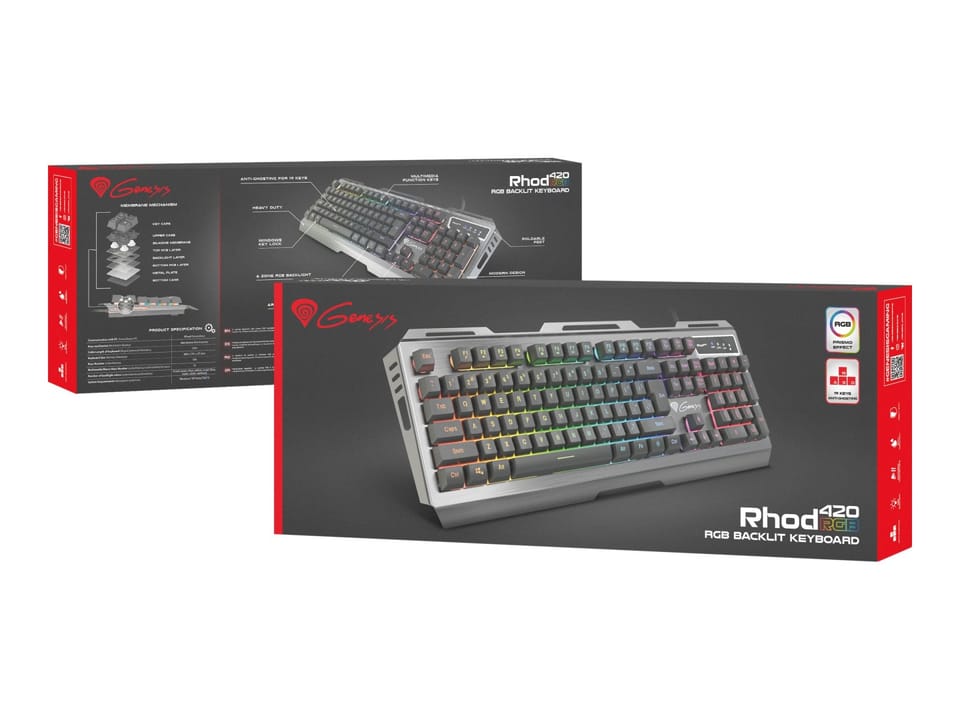 Praca:Układ klawiatury - USTechnical details:Połączenia bezprzewodowe - NoModel - Gaming keyboardŚwiatło LED RGB - YesProducer - GenesisErgonomia:Długość kabla - 1.6Pozostałe właściwości:Technologia łączności - Wired:Producer product name - Rhod 420Design:kolor - Black